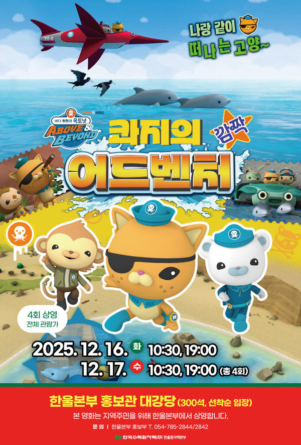 한울본부는 12월 16일과 17일 이틀 동안 한울에너지팜 대강당에서 극장판 애니메이션 ‘바다 탐험대 옥토넛 어보브 앤 비욘드: 콰지의 깜짝 어드벤처’를 총 4회 상영한다. 이번 작품은 옥토넛의 해적 고양이 대원 콰지가 주인공으로 등장해 바닷속 난파선, 열대우림, 사막 등 다양한 공간을 오가며 임무를 수행하는 이야기를 담고 있다. 여러 에피소드가 이어지는 옴니버스 형식이라 어린이들이 부담 없이 집중해 볼 수 있는 점도 특징이다.